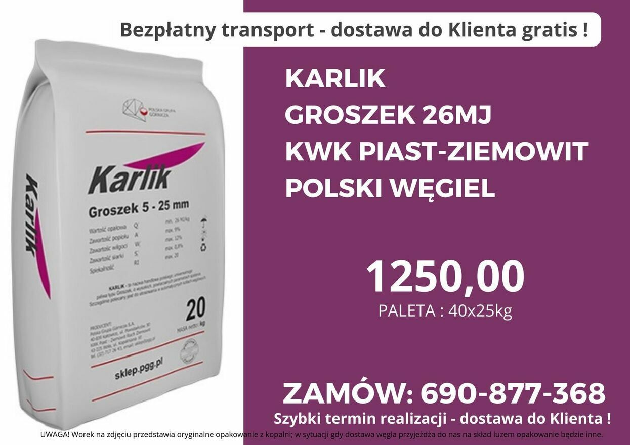 KARLIK 26 MJ ,Polski Węgiel GROSZEK - TRANSPORT GRATIS !